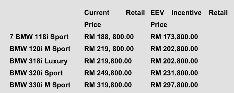 With the new incentives, BMW Group Malaysia will revise its registered retail prices for the BMW 118i, BMW 120i M Sport, BMW 318i Luxury, BMW 320i Sport Line and BMW 330i M Sport lower by up to 8 per cent.