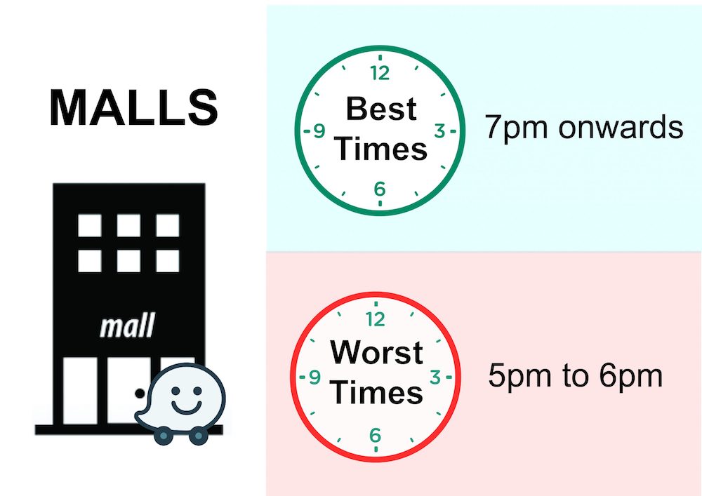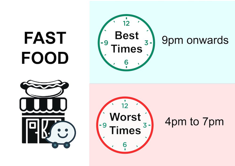 If you’re planning to hit fast food restaurants for a late-night supper or an early morning breakfast, Waze has a recommended time for that. During 9pm to 5am, fast food restaurants should be less crowded than usual. It is best to avoid between 4pm to 7pm since most people are getting ready to “buka puasa” at this period.