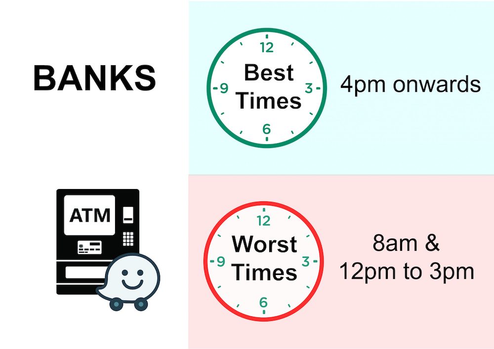 If you want to withdraw money from the nearest ATM, it’s better to do so after 4pm. Although the bank officially opens at 9.30am, many would be making their way to ATMs from 7am to 9am. The bank is expected to reach peak traffic between 12pm to 3pm during the office break hour.