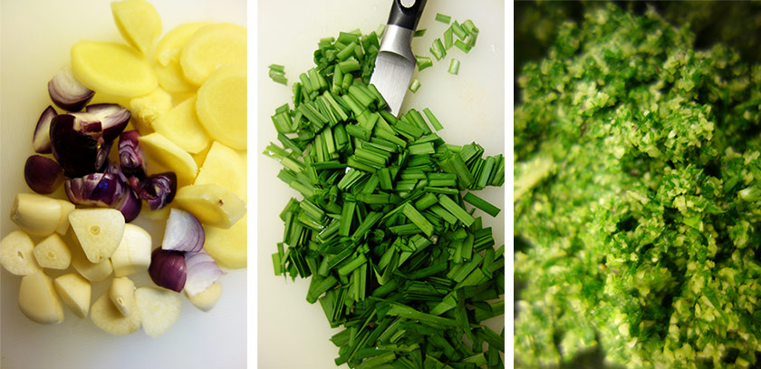 The second bowl is the herb paste, a hand or machine-chopped fine mash of Japanese chives, ginger, garlic and shallots. If you cannot get Japanese chives, then Chinese chives are fine or even spring onions will do.