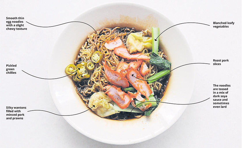 A dry version of the noodles will consist of the noodles generously tossed in a mixture of sauces, sliced roast pork, leafy green vegetables like choy sum, pickled green chillies and wantons.