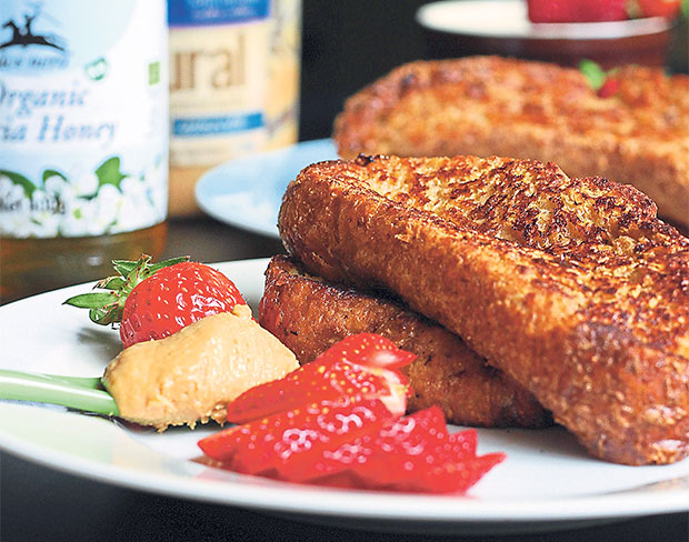 This rustic French toast is delicious on its own but the addition of toppings can never hurt. Use whatever you like but you can’t go wrong with nutty peanut butter, a generous drizzle of organic honey (instead of the usually too-sweet maple syrup), and cut fresh fruit such as strawberries.