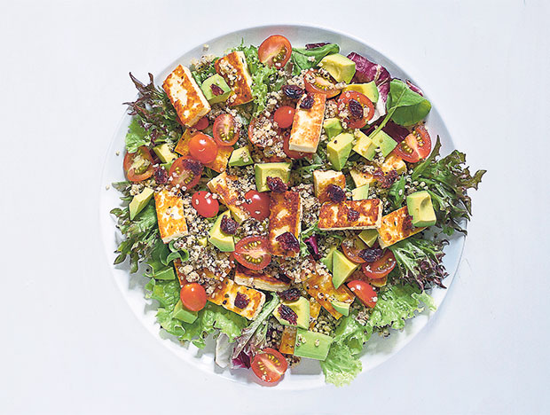 To increase the nutritional punch, why not add some savoury slices of grilled halloumi? A firm, unripened white cheese from Cyprus, halloumi is traditionally made from a mixture of goat’s and sheep’s milk. As it’s brined, halloumi has a strong salty flavour which balances well with the crisp freshness of salad greens.