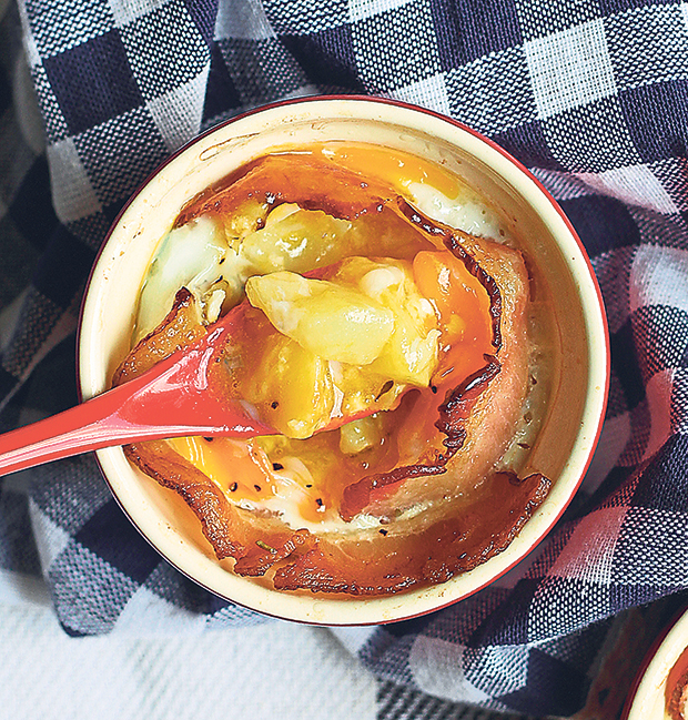 Once the baked eggs are out of the oven, it’s time to dig in with a spoon, scooping out gooey concoction that is part egg, part cheese, part bacon, part potato, and 100 per cent comfort.