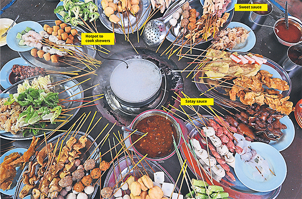 The stall is one that is like no other as it would have a multi-level rack with rows of skewered food on sticks all stacked neatly. On both sides of the stall, there will be two pots of boiling water and in between, there will usually be three types of dipping sauces; chilli sauce, sweet sauce and spicy peanut sauce.