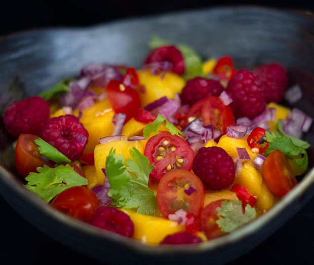 Toss the mango, raspberries, cherry tomatoes, red onion, chillies, cilantro and lime juice together in a large mixing bowl. Taste to check the flavour. Season with salt and pepper. Taste again, adding more salt, pepper or lime juice if necessary.