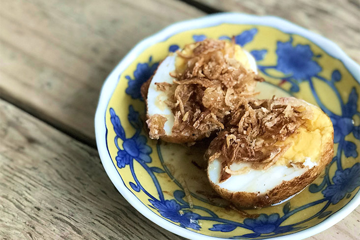 Perfect halves of eggs: creamy heart framed by a firm wall of white, encrusted in a crispy, golden skin. Doused in a silken toffee-coloured sauce loaded with every taste in the Thai flavour spectrum — sweet, salty, sour and spicy — it’s absolutely delicious.