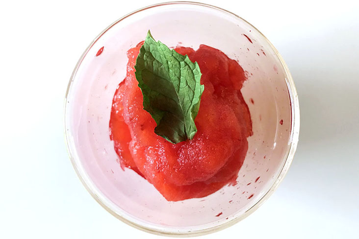 Remove the second bag from the first and scoop the sorbet out into two cups or bowls. Garnish with a peppermint leaf or two, if desired. Serve immediately.