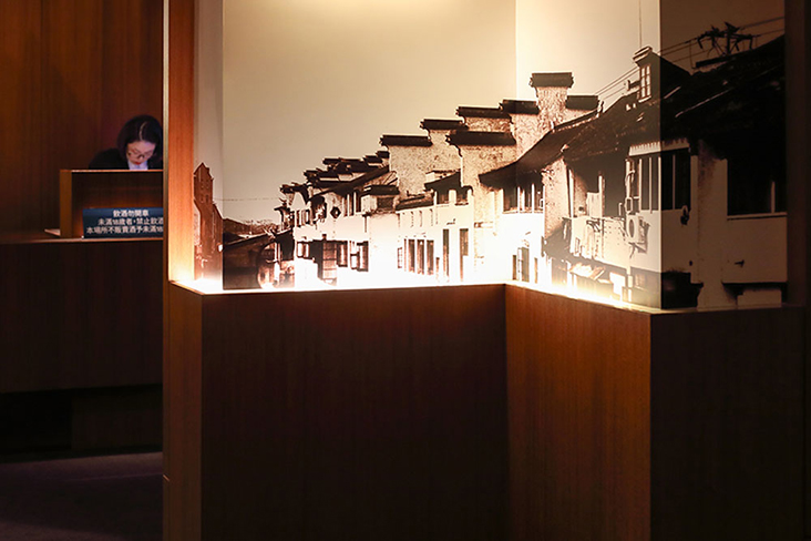 Black and white scenes from Jiangsu Province breathe some minimalist elegance to the wood panelled walls.