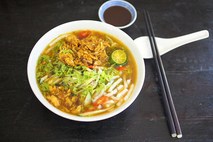 This is paired with flaked fish, shredded cabbage, chopped red chillies and softer rice noodles cut into smaller pieces. This makes it much easier to slurp it all down. If you prefer, you can add hei ko or the more pungent prawn paste to your laksa for a deeper taste.
