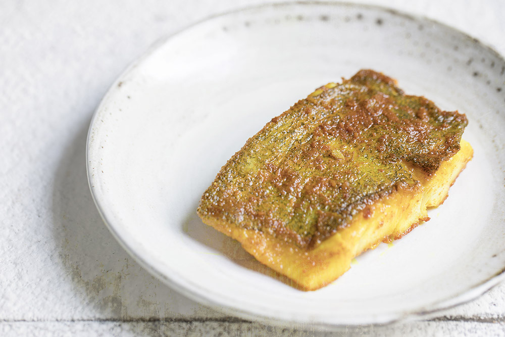In the end I decide to smear a lovely piece of halibut with a generous amount of turmeric powder. A coat of gold. More earthy than piquant, the turmeric also helps the fish skin crisp up nicely in the hot oil.