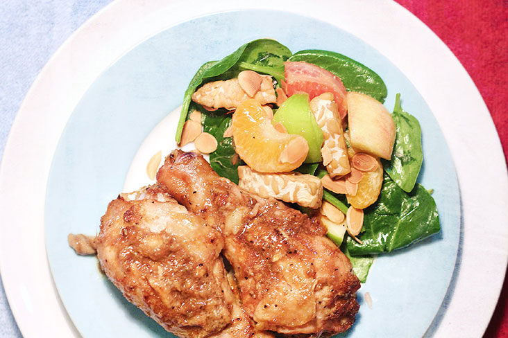 The acids in the mandarin orange juice help tenderise the chicken while segments of mandarin oranges make up the base of the salad. Throw in a few other fruits, some pan-fried tempeh for some light fermented notes and crisp baby spinach – and you have quite a meal.