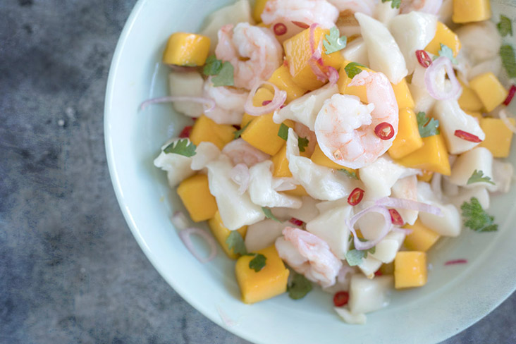 The other aspects of this tropical salad ought to be more familiar: chunks of ripe mango, pale pink shrimp (boiled briefly then chilled immediately), the sharp bite of raw red onions (or shallots), the acid from fresh limes, the heat from bird’s eye chillies (the red cili padi, please, for its startling, vibrant colour).