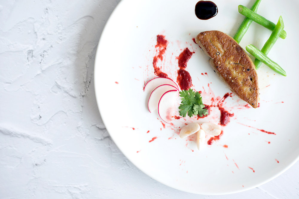Drain any excess fat from the pan seared foie gras by resting it on a plate lined with kitchen towels. While the foie gras is resting, you can assemble the rest of the ingredients: plating the mangosteen, French beans and pink radishes as creatively as you like.