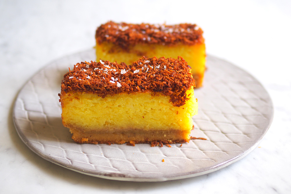 You get soft tapioca and coconut custard that sits on top of a buttery shortbread cookie. On top, there's a dark toasted grated coconut serunding with a touch of sea salt flakes.