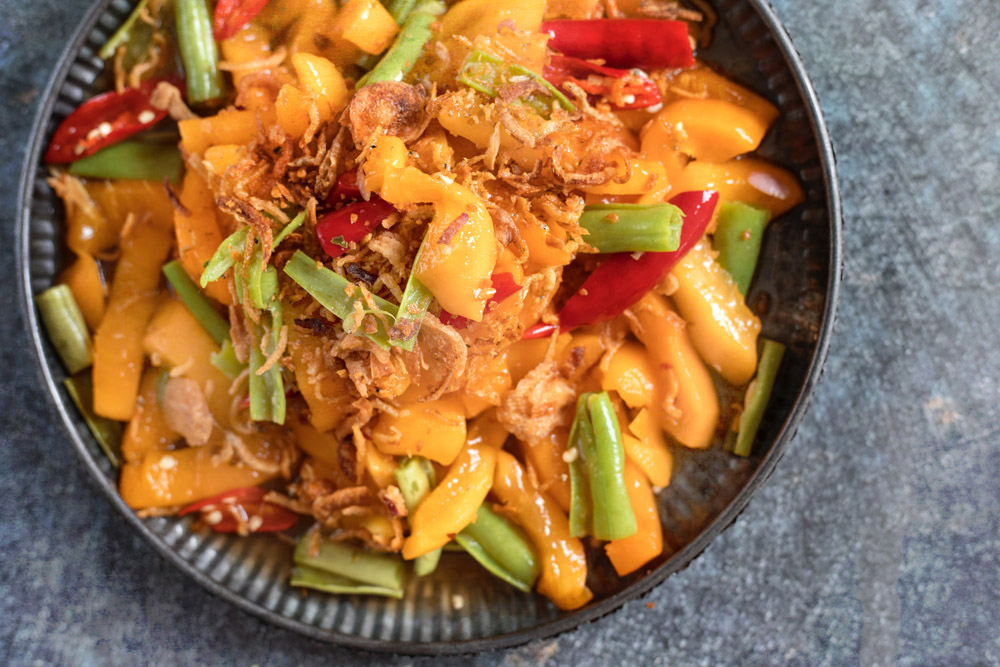 Blanch the French beans so they retain their vibrant green colour and crunch. Use red chillies or red cili padi (bird’s eye chillies), both for their heat as well as their sharp red colour.
