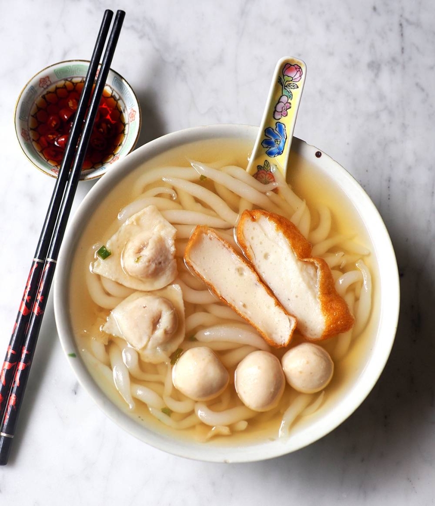 The broth for the fishball noodles is brewed from ikan bilis which gives it a cleaner palette for the accompanying items.