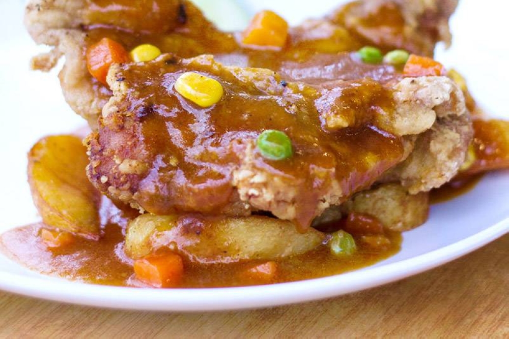 A perfectly deep fried chicken chop rests on a bed of crusty potato wedges, coated with a homemade sauce; the colours of the peas, diced carrots and corn niblets — green, orange and yellow — a colourful celebration of the flavours of yesteryear, reminding us that food is love is love.