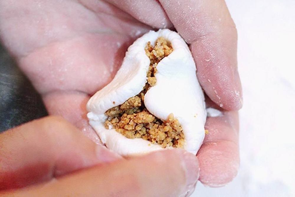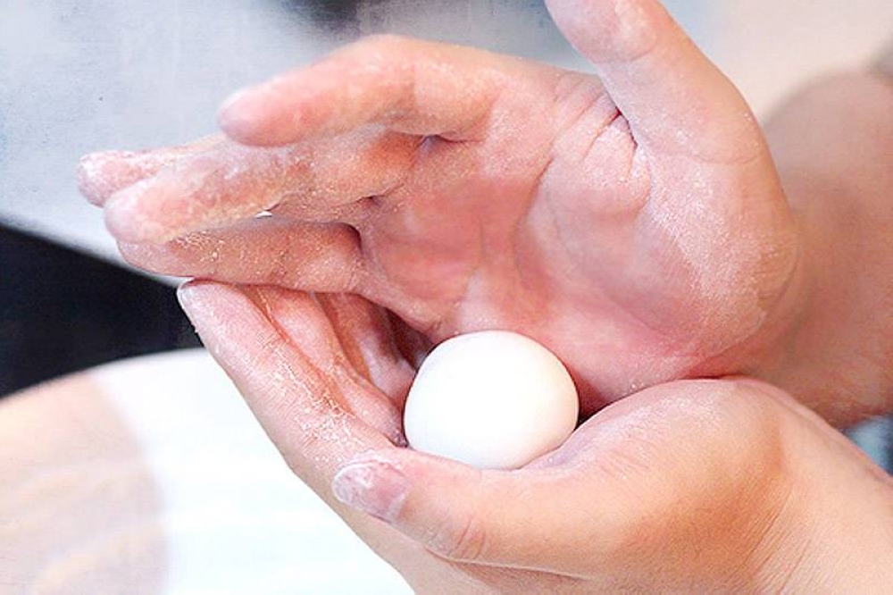 Add one tablespoon of the peanut filling in this well, then fold the edges of the dough around it to seal. Roll the tong yun in your palms till it’s perfectly spherical. Repeat with the rest of the dough and peanut filling.
