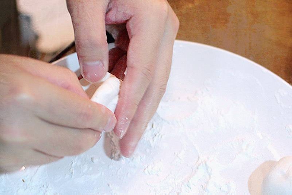 Once the dough is smooth and well formed, cover with a damp cloth so it doesn’t dry out. Break off a small portion of dough, roughly the size of golf ball. Knead it again, then make an indentation in the centre of the ball of dough with your thumb.