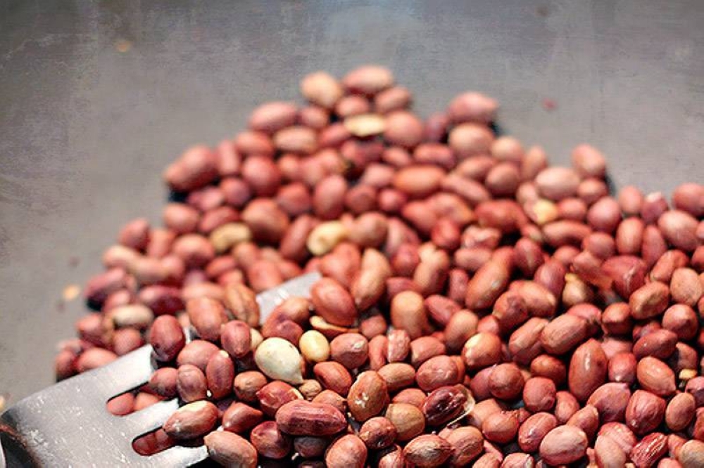 Gently heat a dry wok over low heat. Add the whole peanuts and stir continuously with the spatula to ensure nothing gets burned. Once the peanuts have toasted to light brown colour and smell aromatic, about five minutes, remove from the wok and set aside to cool.