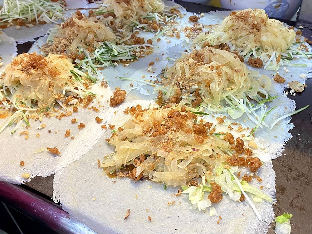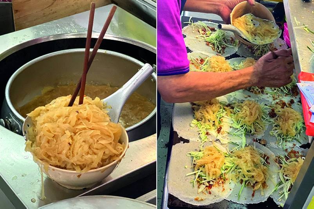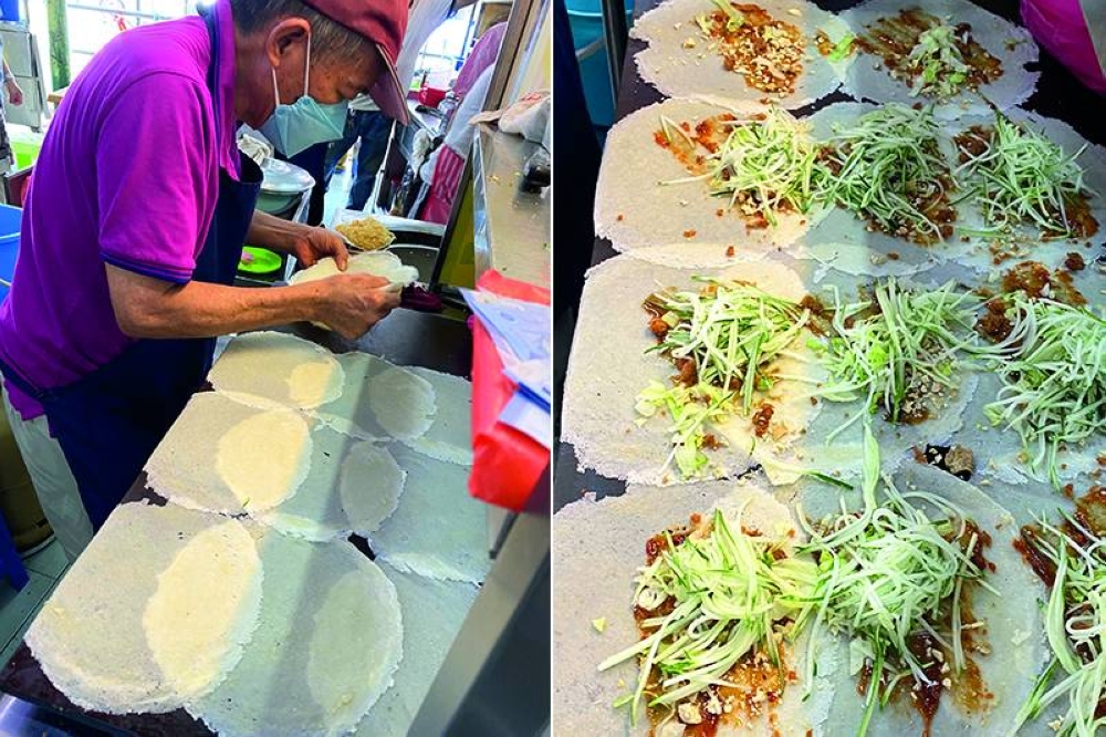 It's mesmerizing to watch the process, as layer by layer of ingredients are systematically added to the popiah skins.