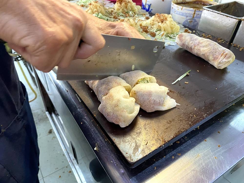 The final flourish is another sprinkle of crispy dough bits before it is deftly rolled up. With a sharp knife, the popiah is cut into three pieces. You buy them in a set of two pieces for RM6. He then wraps them up in a clear plastic sheet.