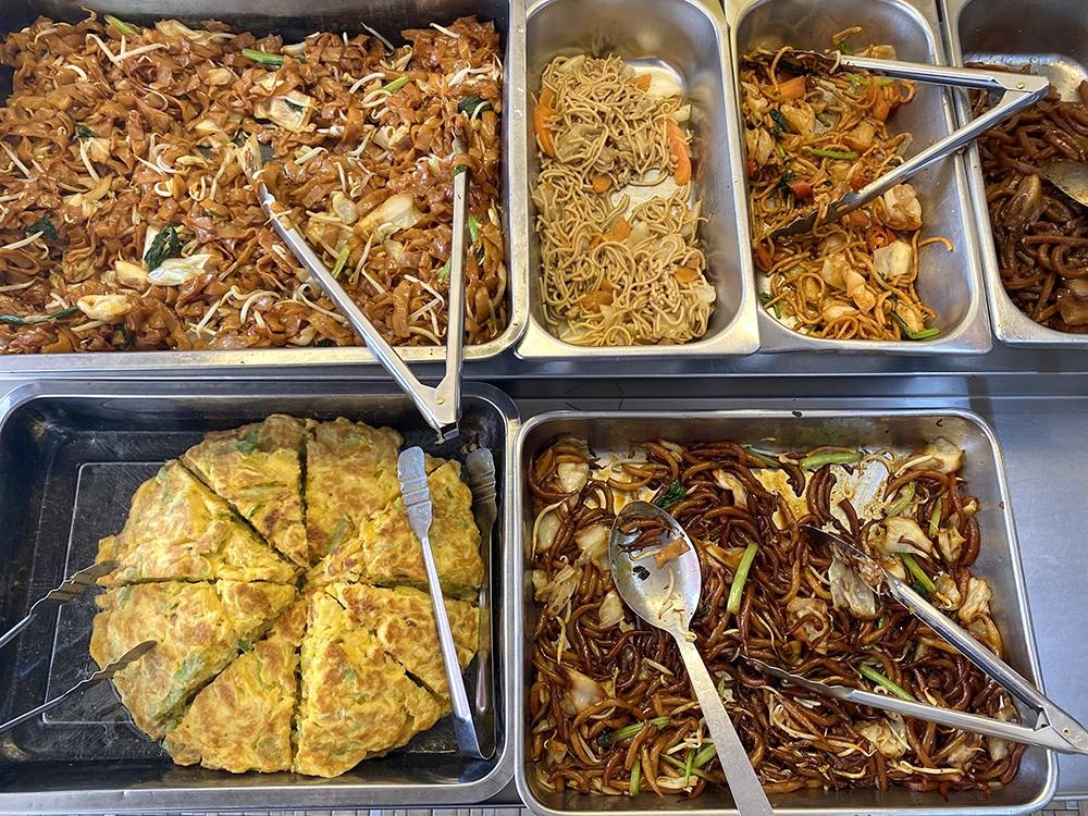 There's fried loh shue fan, meehoon, hor fun and Hokkien mee. You can also get fried macaroni, spaghetti and yee mee. There's also mee Siam and nasi lemak. Just help yourself to pickled green chillies or sambal to pair with your fried noodles.