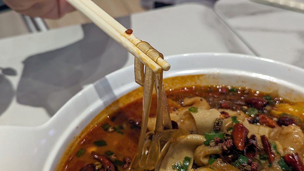 The broth was teeming with Sichuan peppercorns, dried chillis and so much heat that my tongue was practically numb to any suggestion of piquancy – but it was pretty addictive. Best of all were the beancurd skins and sweet potato noodles, both playful textures that maximised surface area for optimal spice delivery. The slipper, chewy and transparent noodles were especially delightful.