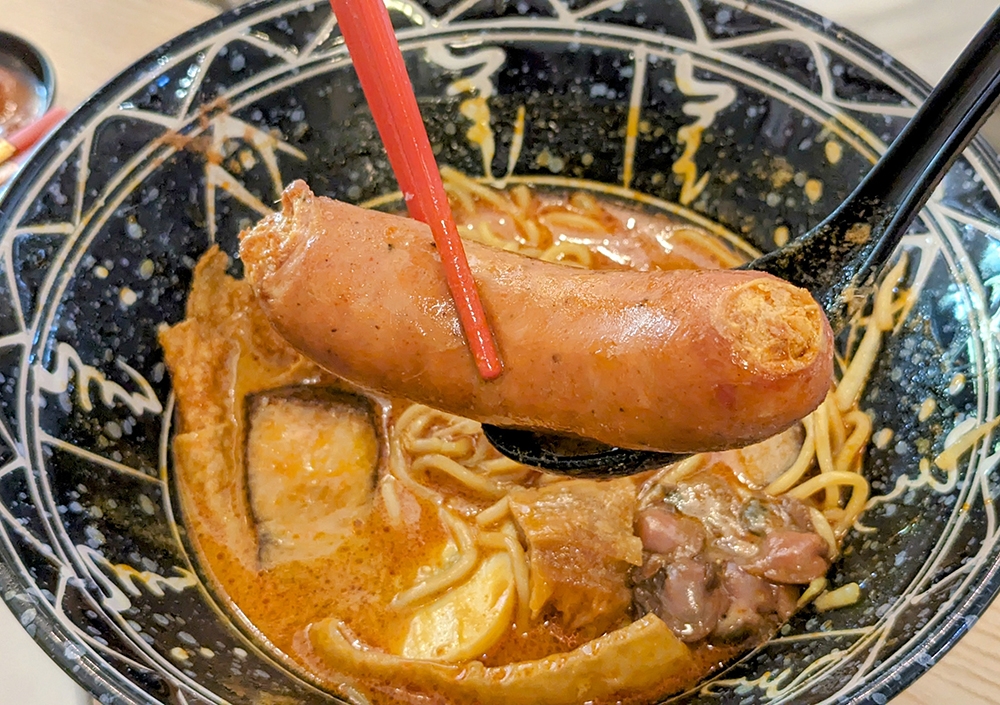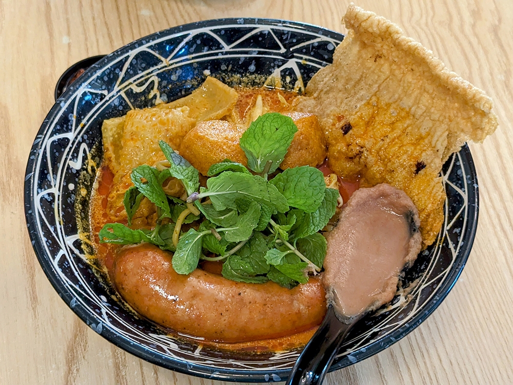 There are 14 different variations of curry mee on the menu, and we settled on the siham + chorizo pork sausage + honey BBQ Nyonya curry laksa (RM26.90).