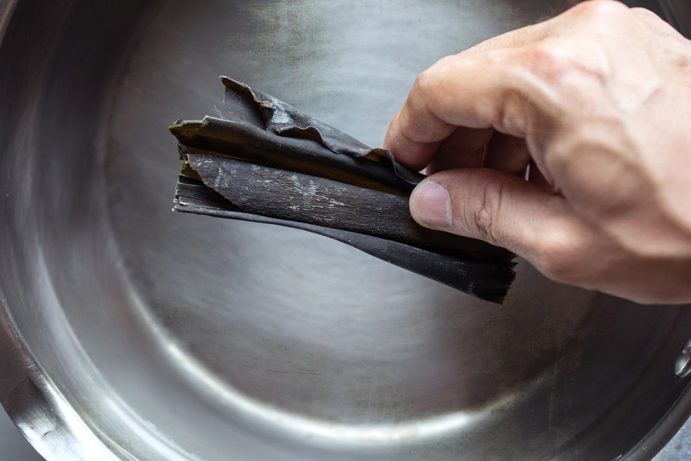 Right before the stock comes to a boil (observe the tiny simmering bubbles), remove the piece of kombu from the pot.