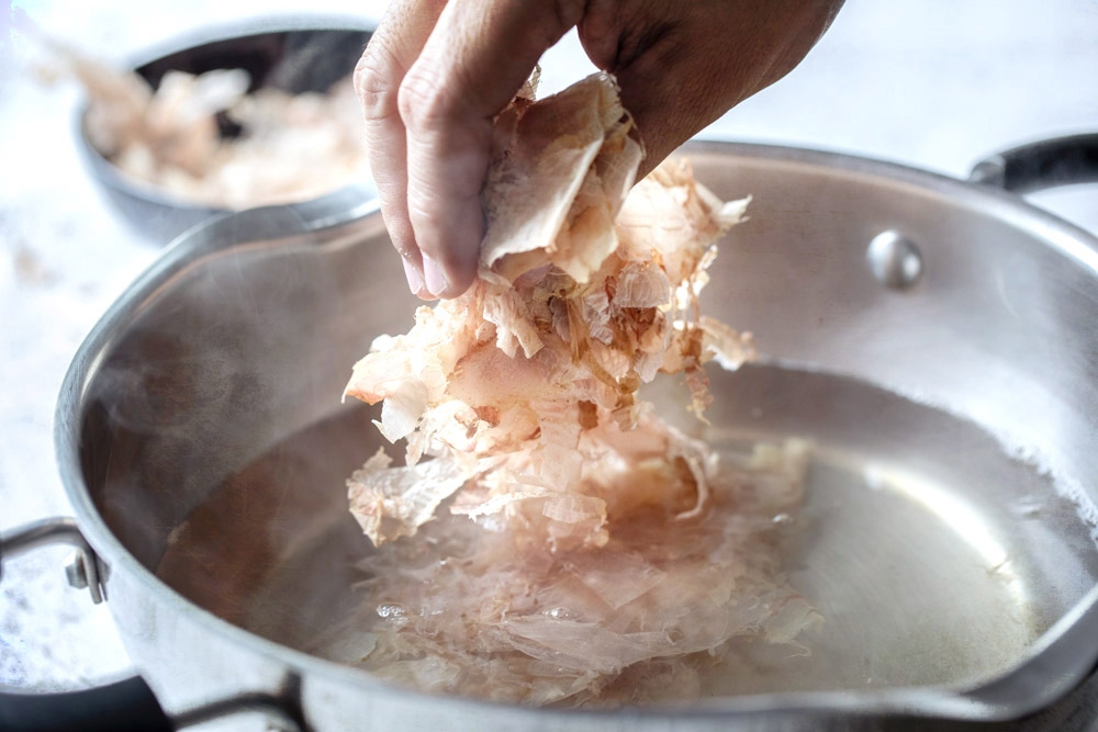 By adding the fish flakes to the seaweed dashi, we create awase dashi (or "combination” dashi), which is the most widely used soup stock.