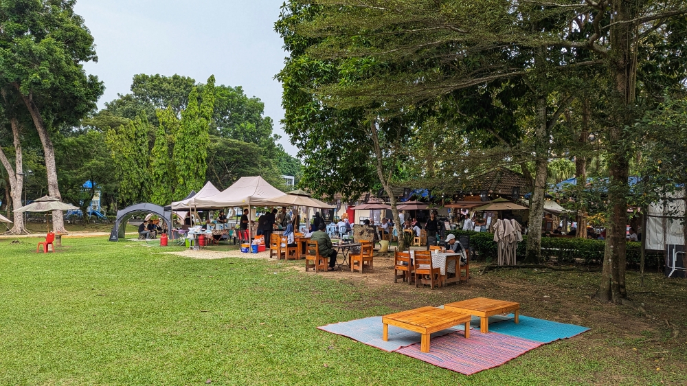 Picnic mats, camping tents and a few loose tables make up the seating, mostly clustered near the park’s entrance, where a gazebo houses Warong Tiga Lima.