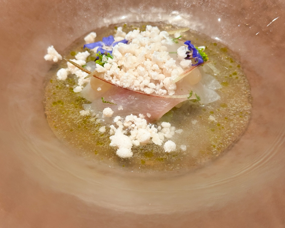 The first course is the striped jack presented with a clear tomato water and fig vinegar dotted with fig leaf oil, showered with ginger flower snow, giving it an ethereal smoky mist, leaving a clean yet complex flavour on the tongue as the floral fragrance tickles your nostrils.