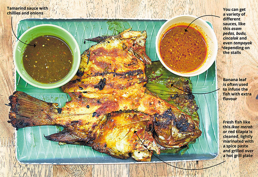 Some stall owners, like Gerai Pak Din in KL’s Tanglin food court, prefer grilling the fish on a hot charcoal fire to infuse it with a smoky taste. The fish is grilled in enclosed wire racks over the hot coals without any marinade. All it needs is a light rub of salt and turmeric.