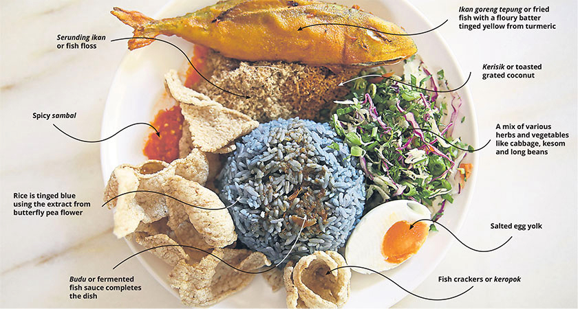 What makes the dish stand out is the unique blue tinged rice. The light blue shade is naturally extracted from the butterfly pea flower or bunga telang. In Kelantan, they also serve a yellow rice version where turmeric is used to colour the rice.