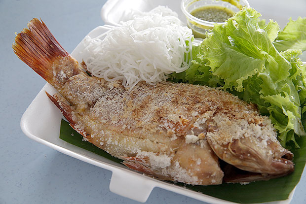 The most recent addition to the stall is Pla Pao or grilled salt-crusted tilapia for RM29. Leong uses a special contraption that mechanically turns the salt-crusted fish over hot charcoals saving him the hassle of constantly monitoring the fish all the time. The cavity of the fish is stuffed with kaffir lime leaves, crushed lemongrass stalks, onions and garlic to infuse it with flavour. A salt crust packed on the fish helps to retain its juices within during the grilling process, which keeps the fish moist and succulent.