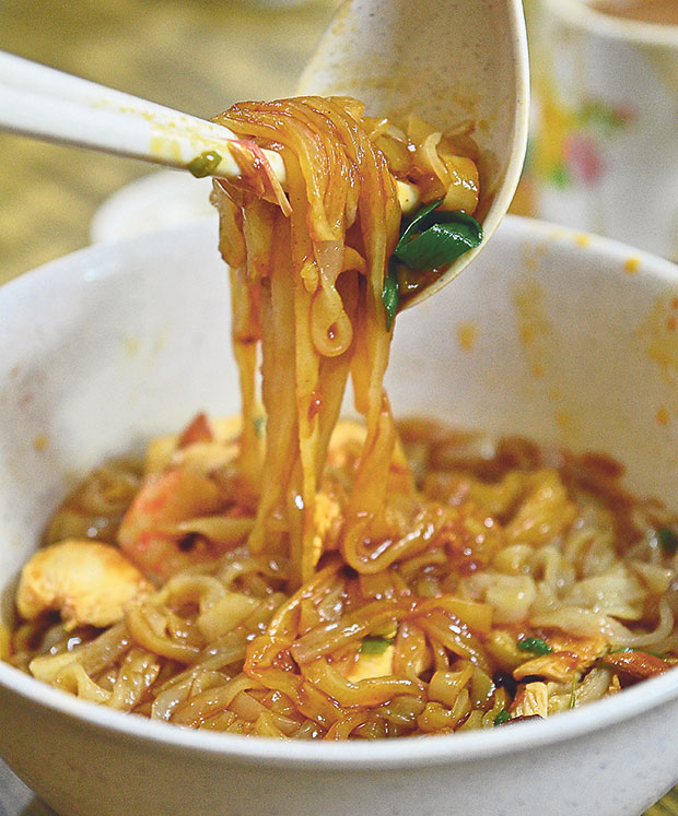 The secret lies in the incredibly flavoursome soup with that vivid layer of orange oil that comes from boiling the prawn heads. Throw in a handful of shredded tender poached chicken, halved shrimps and chopped spring onions, and served with a small saucer of chopped bird’s-eye chillies in soy sauce, you may find yourself downing a bowl in record time; slurping up every strand of the noodles and drinking up every drop of soup.
