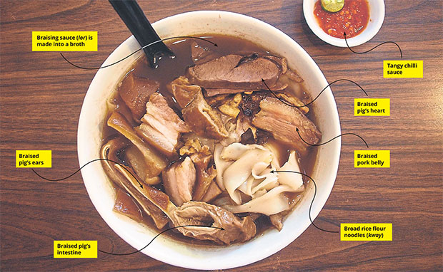 Essentially, it’s broad rice noodles (kway) served in a braising sauce (lor) that is mixed with water to make it into a broth for the noodles. It’s served with a mix of pig’s innards (chap). Some places also serve the noodles with braised duck meat, beancurd, tofu puffs and braised hard-boiled eggs. The braising sauce is made from dark soy sauce and a mix of spices. For a good version, the sauce needs to be fragrant for the bowl of kway chap to be tasty. Most importantly, the innards must be clean so there is no off-putting smells, and not overcooked.