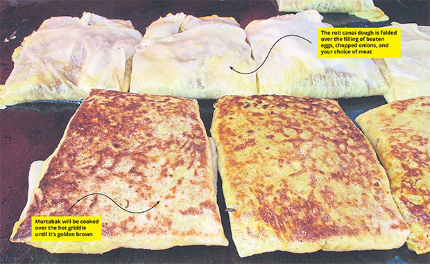 Essentially, it starts with the same dough as roti canai, which is stretched out and placed on a hot griddle. A ladle of murtabak filling — beaten eggs, chopped onions, minced meat and mixed spices — is scooped on top of the stretched dough.