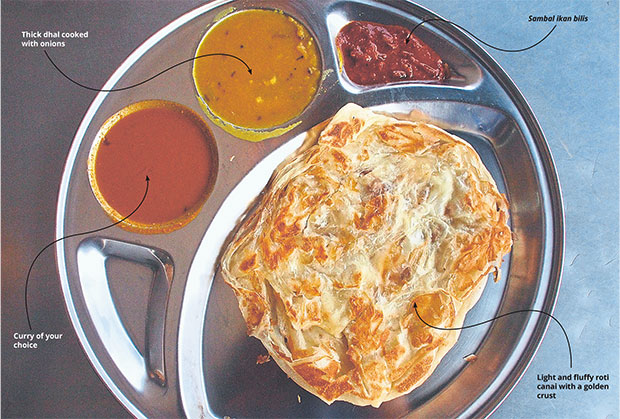 This newcomer in Bangsar is pulling in the crowds with their food. The roti canai served here is a light and extremely crispy one. Ask for a garing version and it’ll come with flaky crumbly bits dropping off. Unlike the flat versions of roti canai, this one has puffed up layers, as it’s given a few vigorous claps with cupped hands just before it’s served. You can enjoy the roti canai on its own. For a more substantial meal, order their fried items or add a plate of tender chicken varuval with your roti canai.
