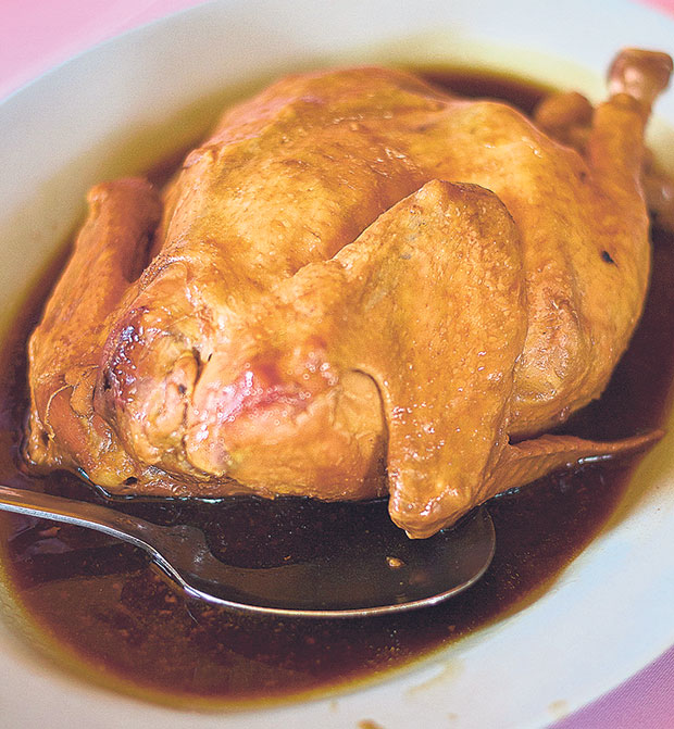 A dark gravy dribbles out as we tear into the bird, the stuffing infusing its natural sweet juices with a savoury, herbal flavour. Ingredients for the stuffing vary: here, we detect the presence of dried shiitake mushrooms, Chinese sausage, star anise, five-spice powder and cinnamon.