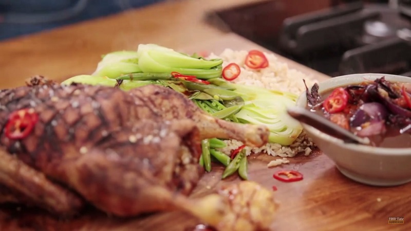 Oliver serves the duck with brown rice, a side of steamed greens. He’s also got a nifty tip on how you can use the duck fat that has rendered out.