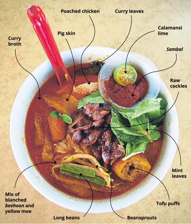 Each stall offers different toppings but the basic bowl has blanched noodles, tofu puffs, vegetables like long beans and bean sprouts and some protein in the form of poached chicken, curry chicken or just fishcake slices. Juicy cockles are a must for your bowl.