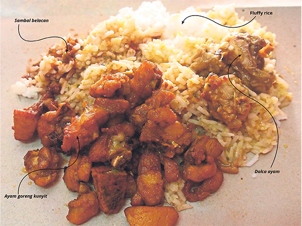 The rice is also topped with bite-sized pieces of ayam goreng kunyit or turmeric fried chicken. Last but not least, the dish is completed with a spoonful of spicy sambal belacan. The simple dish makes a delicious meal that will have you asking for seconds. It’s also priced reasonably, as a basic packet is RM5.