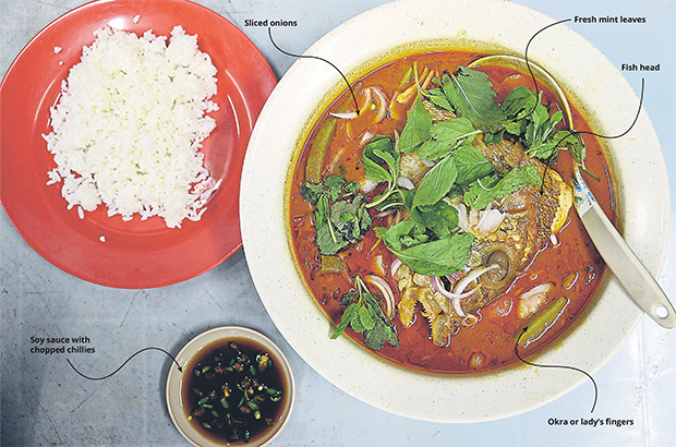 Though the curries can be prepared differently, each pot of fish head curry must have the requisite fish head, some chunks of fish meat and okra (lady’s fingers). Depending on the style, some also have plenty of onions and are topped with some fresh mint leaves.
