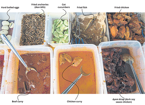 Here are some stalls offering a choice of dishes to go with your nasi lemak. Some of these places are open for breakfast and some only for dinner.