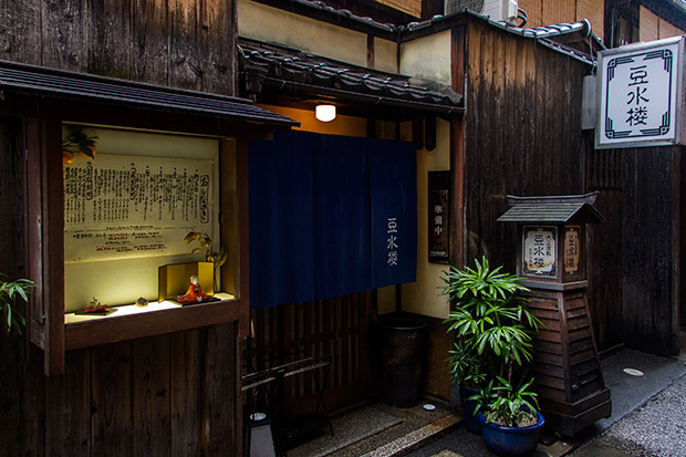 To get to the restaurant, we turn into a small alley nestled along Kiyamachi-dori, just west of the river Kamogawa. Here we discover an old machiya (traditional wooden townhouse) easily identified by the large white chochin paper lantern outside its entrance.