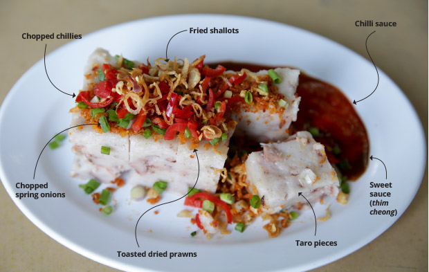 The pieces of yam cake are eaten with chilli sauce and sweet sauce or thim cheong. As every stall has their own recipe, it is worth your time to try the snack out when you see it being sold.