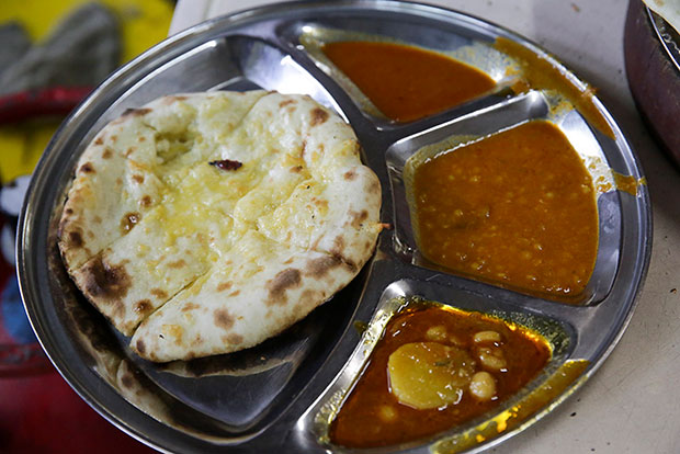 Once it is ready, he will use the two metal rods to pick up the flatbread and flick it out from the hot oven. Just before it is served, they add a smear of margarine over the hot naan. The cheese naan (RM5) will be served with dhal, chickpeas and potatoes for extra flavour.